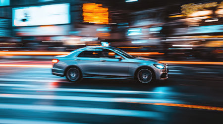 A thrilling capture of a silver taxi speeding through a vibrant city at night, with colorful lights creating a dynamic blur. Perfect for themes of urban transportation and city vitality.