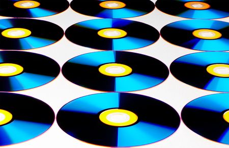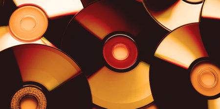 Variety of Arranged CD Disks or DVD Disks on Orange Background. Horizontal Image Composition
