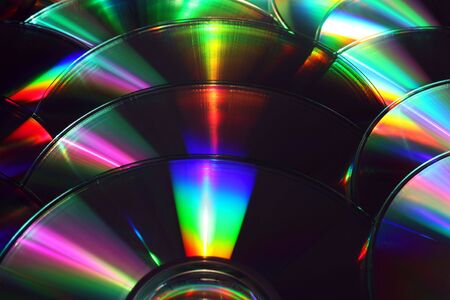 CDs / DVDs lying on a black background with colorful reflections of light.