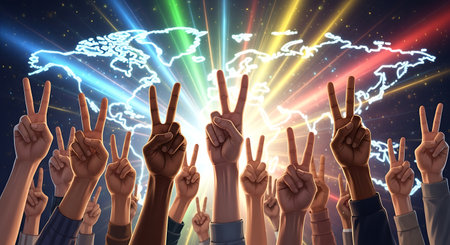 many hands showing victory sign, pride colors