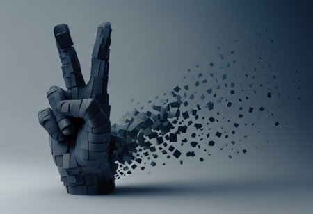 Peace, victory, and harmony symbols. A hand making a peace sign, with surrounding red and gray abstract elements. Minimalist art collage