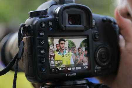 A man shoots with a camera. The photographer looks at the camera screen close up