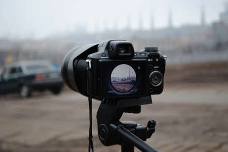 A modern camera displaying a stunning urban skyline view on its screen. Ideal for showcasing digital photography and modern equipment.