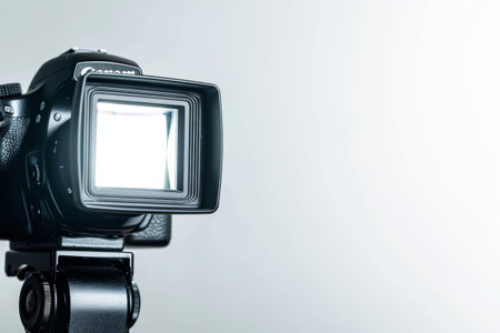 Professional studio for photo video filming with lighting and large cyclorama background, pov from camera on tripod with live viewfinder screen with live recording.