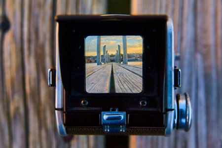 Vintage Camera Framing Dock and Cityscape at Sunset