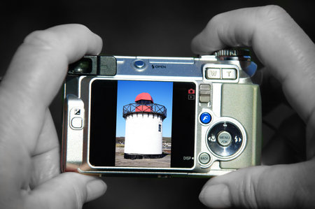 Burry Port, Wales, UK – September 20, 2007: Amateur photographer taking a picture of the Burry Port lighthouse