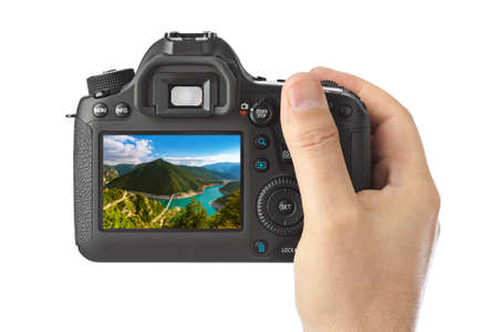 Hand with camera and Piva Canyon - Montenegro image (my photo) isolated on white background