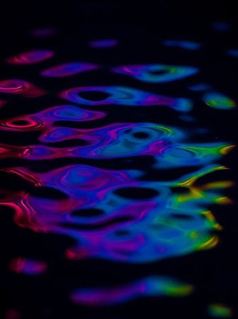 Dark water surface displaying abstract swirling patterns of vibrant pink blue green and yellow light reflections creating a fluid and ethereal effect.