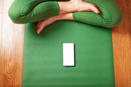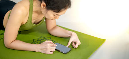 Women play mobile and sit on the green yoga mat while resting for a doing practice in the home.