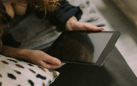 Close up of a young man comfortably lying on a bed with a tablet and touching the screen. Halfshot of a man sitting with black screen tablet in hands. Man's index finger raised over the touchscreen.