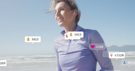 Image of social media data processing over caucasian woman with smartphone on beach. Global fitness, networks, computing, digital interface and data processing concept digitally generated image.