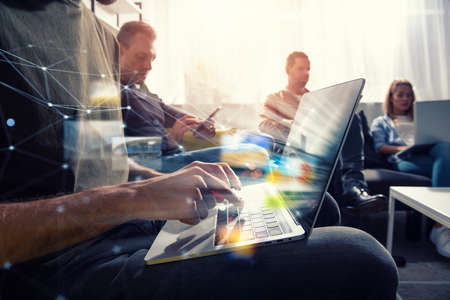 Coworking process, entrepreneur team working in creative office space. using digital tablet docking keybord and laptop with smartphone on marble desk,light beam effect