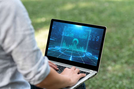 Coding software developer work with AR new design dashboard computer icons of scrum agile development and code fork and versioning with responsive cybersecurity.Website designer working digital tablet.