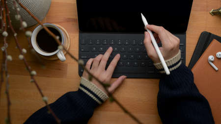Overhead shot of male typing on laptop with stylus, coffee cup and decoration on white desk