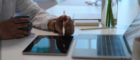 Side view of male hand using digital tablet and holding a cup of beverage on worktable in home office room