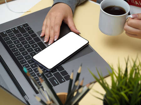 Close up view of businesswoman take one rest with smartphone and drinking coffee while sitting at workspace