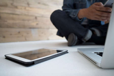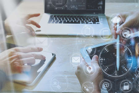 Co working process, entrepreneur team working in creative office space. using digital tablet docking keyboard and laptop with smart phone on marble desk,light beam effect