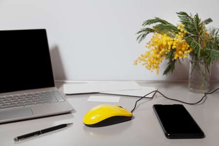 open laptop with a yellow mouse stands on a gray table. Nearby is a mobile phone business card and a bouquet of yellow mimosa. View from above