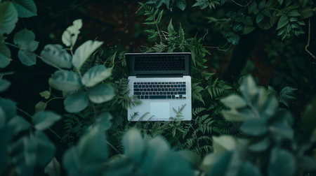 A laptop nestled in lush greenery outdoors, symbolizing the connection between technology and nature, ideal for themes of eco-friendliness and remote work.