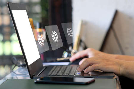 Business concept. Businessman working generic design laptop. Touching screen smartphone. Worldwide connection technology interface.