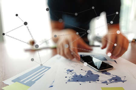co working team meeting concept,businessman using smart phone and laptop and digital tablet computer in modern office with virtual interface icons network diagram