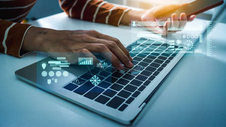 Businessman uses capable laptop computer to analyze business data analytic for marketing strategy and customer relationship management