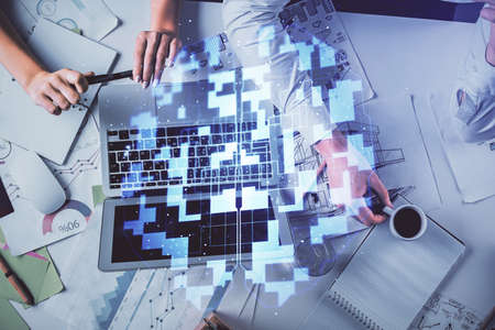 Double exposure of man and woman working together and data theme hologram drawing. Computer background. Top View.