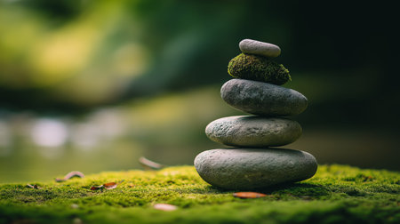 Smooth river stones balancing on vibrant moss near water, symbolizing peace and stability. Stacked river stones balancing on moss creating zen harmony wallpaper