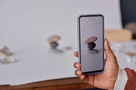 Minimal closeup of female hand holding smartphone and taking professional product photography with natural stone composition on screen copy space