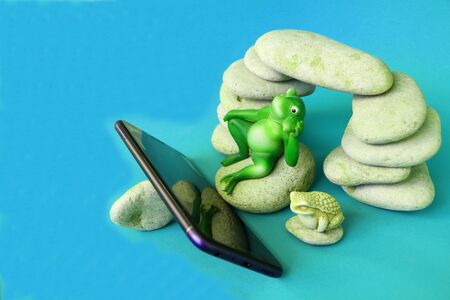 Close-up - frogs on the stones watching news on a smartphone.