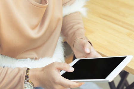 Concept of internet and communication. blank empty tablet computer in the hands of women on the beach