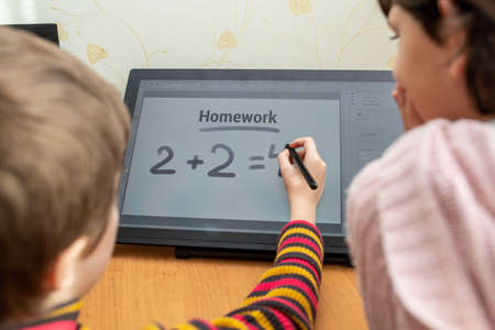 Children do homework on a graphic tablet at home. Remote Education Concept. Distance schooling online.
