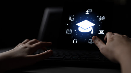A hand holds a tablet displaying a glowing graphic of a graduation cap. The image showcases a digital learning concept against a blurred background with blue bokeh effects. Soft lighting illuminates the scene, suggesting an indoor setting. Suitable for various educational or technological content.