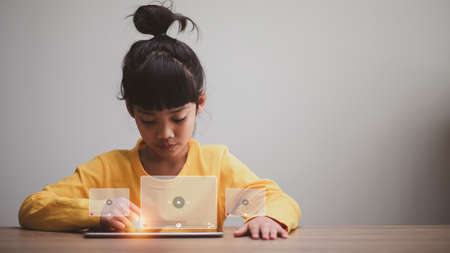 Asian girl using tablet for streaming online, watching video on internet, live study, tutorial, online learning, education, homeschooling. during Covid-19 pandemic lockdown.
