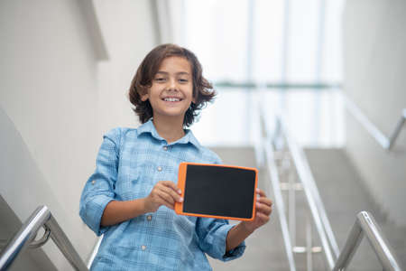 Joyful mood. Joyful smiling school-age boy in light blue shirt showing tablet screen standing on stairs