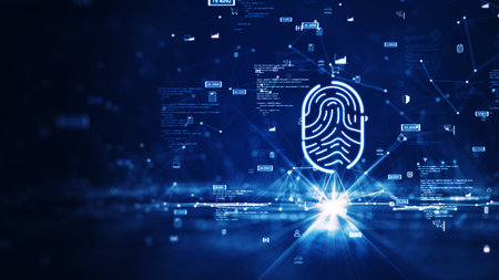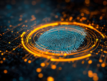 A high-tech biometric process highlights a fingerprint with luminous blue dots and intricate data streams, symbolizing digital security and identity v