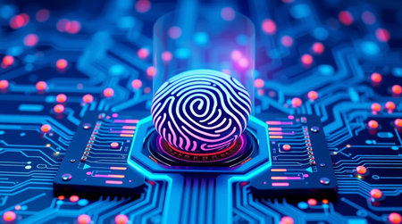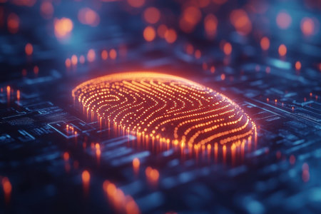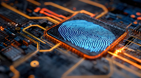 A vibrant digital fingerprint illuminates a circuit board, highlighting advancements in technology and security.
