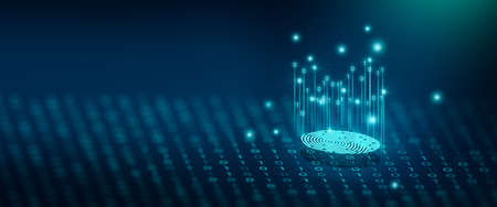 Fingerprint scanning concept to login in internet network connection. Prominent fingerprint on the right It consists of a polygon with binary code and a small icon on a dark blue background.