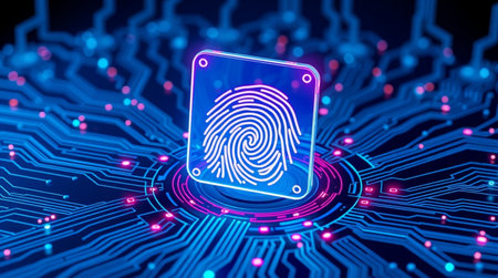 A sleek, high-tech screen features a glowing fingerprint pad, radiating neon hues, embodying tomorrow?s biometric security innovations.