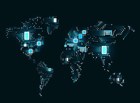 Abstract world map with cpu. Circuit board. Technology background. Vector illustration. Eps 10