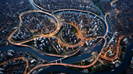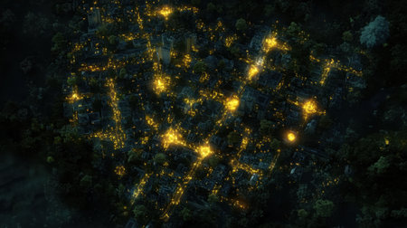 Discover a breathtaking aerial view of a nighttime cityscape, where golden lights twinkle amidst the serene darkness, creating a magical and enchanting atmosphere.