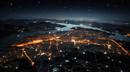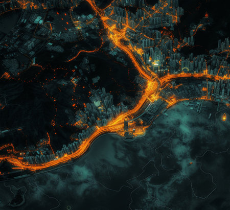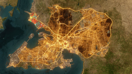 Satellite view of a coastal city at night. The intricate network of roads and highways glows with golden light, illustrating urban energy, data flow, and connectivity.