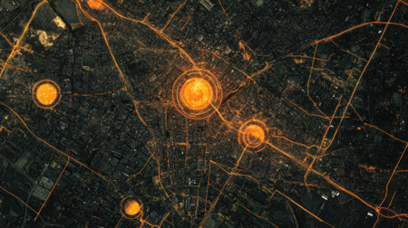 Futuristic smart city with glowing orange circles at night illustrating data connection and communication