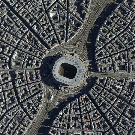 High-angle aerial view of a stadium encircled by a radial city grid with roads and railways. The buildings are mostly gray and white, with some red roofs.
