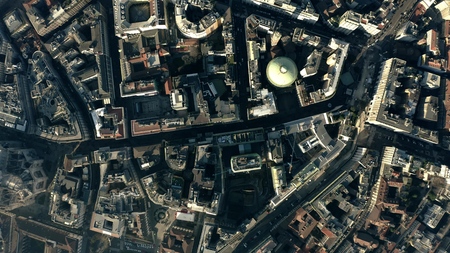 Aerial top down view of the city streets and houses pattern in the centre of Milan, Italy