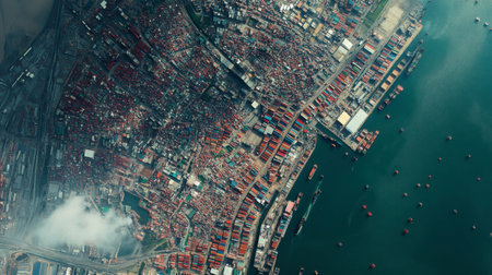 A captivating aerial image showcasing a bustling shipping port filled with colorful containers and various ships, highlighting the intricacies of global trade and maritime operations.