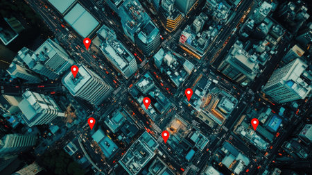 Birds-eye shot of a busy city with red pins marking notable spots, highlighting connectivity and smart navigation.