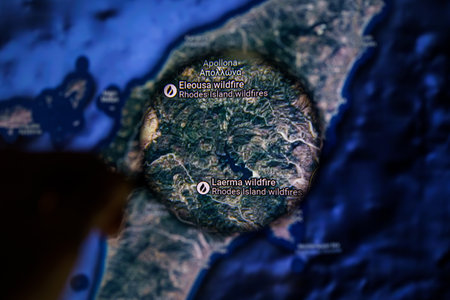 Rhodes island on wildfire. Greece Rhode island on maps through magnifying glass