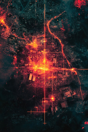 High resolution satellite surveillance captures the neon lit activity of military operations showing the movement of soldiers and equipment through an urban