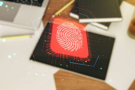 Multi exposure of abstract graphic fingerprint sketch and modern digital tablet on desktop on background, top view, fingerprint scan data concept